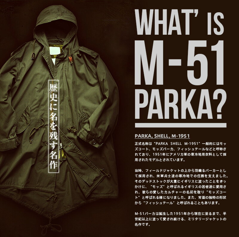 M-51パーカは誕生した1951年から現在に至るまで、半世紀以上に渡って愛され続けるミリタリージャケットの名作です。