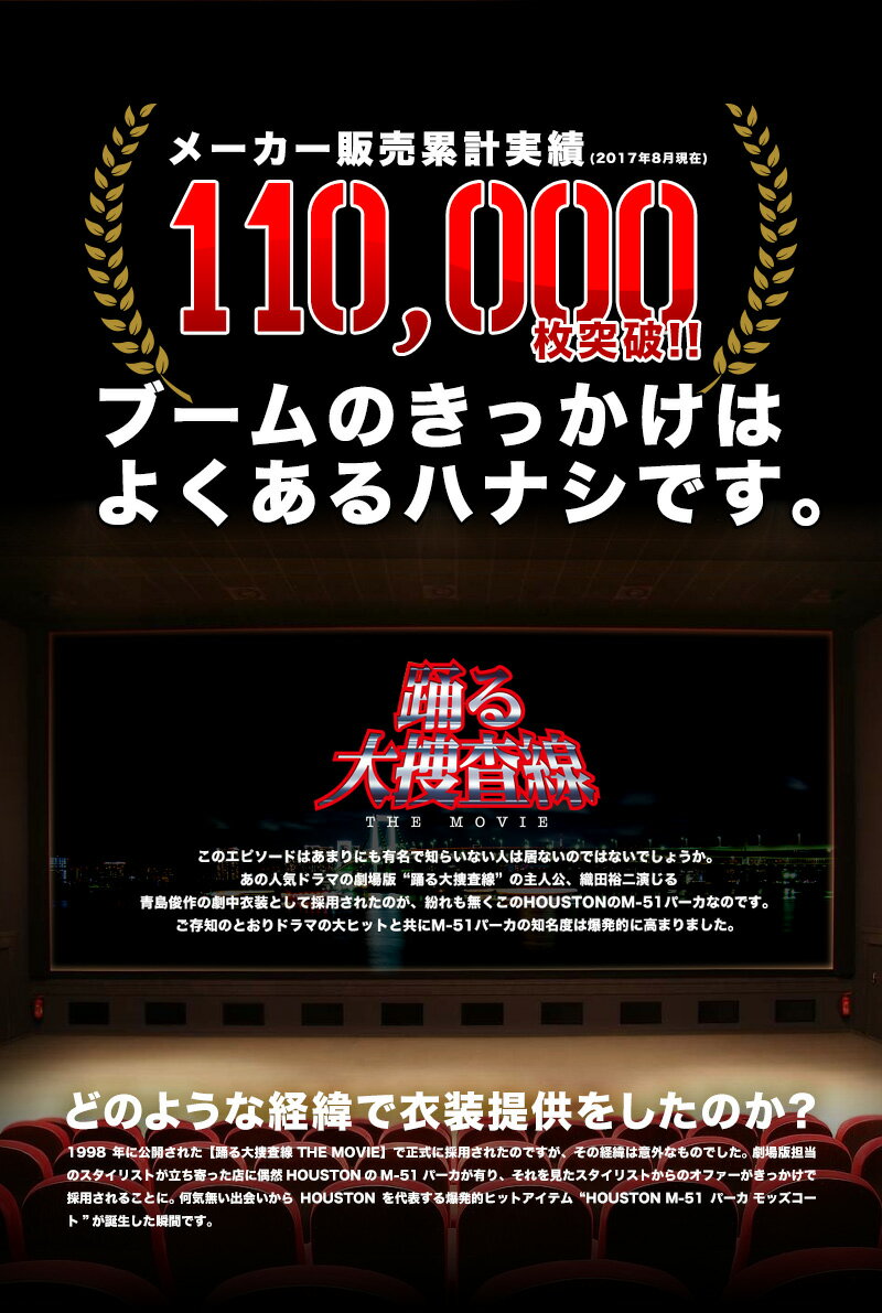 ■関連キーワード M-51 パーカ メンズ モッズコート ミリタリーコート ヒューストン ビジネスコート 青島 踊る大捜査線 ■商品説明 現在に至るまでに11万枚(2017年7月現在)という驚異の販売数を記録し、今もなおアウターの定番であり続けるM-51パーカ。